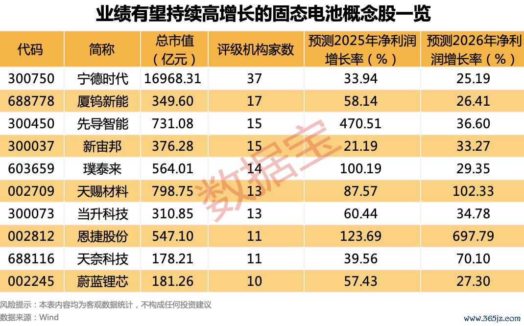 业绩预期方面,固态电池概念股中,10只概念股获至少10家机构评级,且机构一致预测2025年和2026年业绩有望持续超20%幅度增长,包含恩捷股份、璞泰来、先导智能、天赐材料、厦钨新能等股。