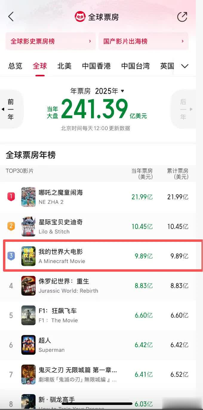 排在第二的是《星际宝贝》蔚莱策略,排在第三的则是《我的世界大电影》。