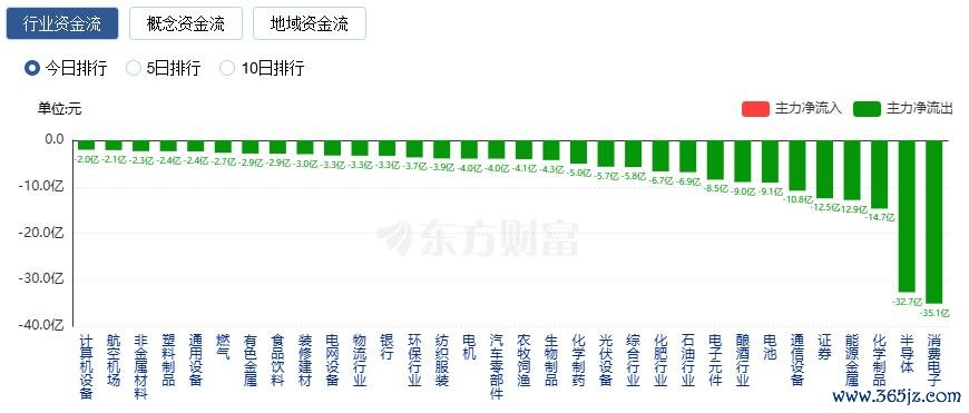 净流出方面,消费电子、半导体、化学制品等净流出排名靠前,其中消费电子净流出35.14亿元。