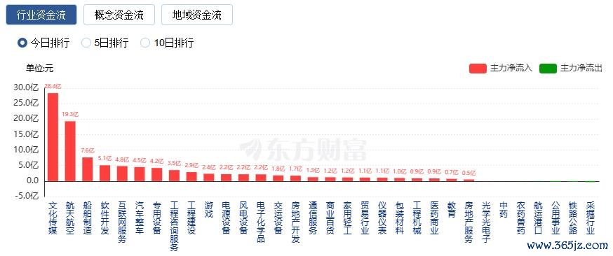 行业资金方面,截至收盘,文化传媒、航天航空、船舶制造等净流入排名靠前,其中文化传媒净流入28.39亿。